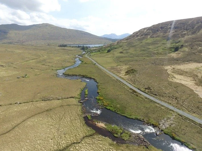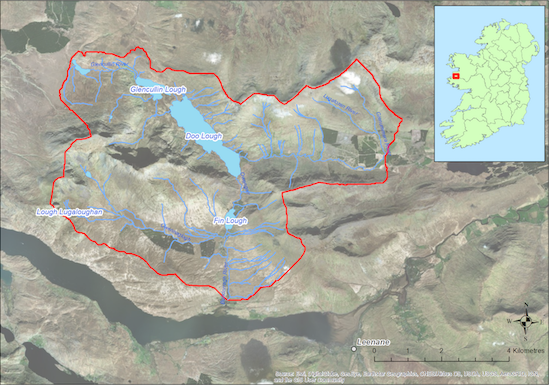 Located to the North-west of Leenaun this catchment (48.1 sq km) drains to the sea at Killary Harbour to the South. The catchment comprises a north-south orientated valley with the Mweelrea Mountains to the west and the Sheeffry Hills to the east. There are a number of lakes within the catchment including Doo Lough and Finn Lough, from which the Bundorragha River flows southwards. The underlying geology is predominantly acid comprising an Ordovician conglomerate. The dominant soil type is peat. Land use within the catchment includes forestry (6%), extensive areas of commonage, and sheep farming (ca 143 active farmers). There are two accommodation facilities (Delphi Lodge and Delphi Activity Centre) in proximity to the Bundorragha River and angling is popular. The population of freshwater pearl mussels is large and is concentrated in the lower reaches of the Bundorragha River.