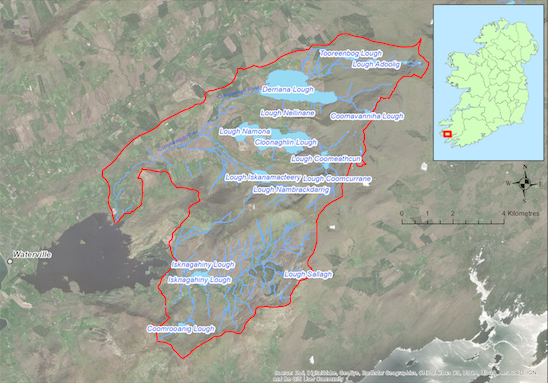 Located on the western side of the Iveragh Peninsula this catchment (74.8 sq km) drains to Lough Currane to the West. The catchment covers the lower slopes of the Macgillicuddy’s Reeks and has a number of lakes including Derriana Lake, Cloonaghlin Lough, and Isknagahiny Lough, from which the main tributaries flow westwards. The underlying geology is Old Red Sandstone and the dominant soil type is peat. Land use within the catchment includes forestry (5%), commonage, mixed livestock farming (ca 108 active farmers), and both active and historic peat cutting. Angling is popular along the main river channels within the catchment. The population of freshwater pearl mussels is estimated to be ca. 100,000 and occurs in the lower reaches of both the Cummeragh and the Capall River.