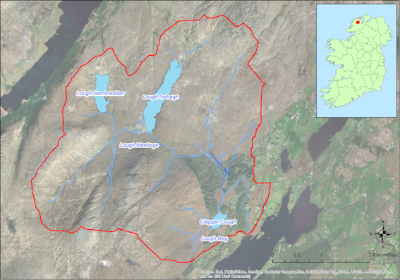 Located in a rural area approximately 10km west of Letterkenny this catchment (17.5 sq km) drains into Gartan Lough to the east. The catchment covers some of the upper and lower slopes of the Derryveagh Mountains and there are a number of lakes including Lough Inshagh from which the main tributary stream of the Glaskeelan River flows south-eastwards. The underlying geology is predominantly acid comprising granite. The dominant soil type is peat. Land use within the catchment includes forestry (7%), extensive areas of commonage, and sheep farming (ca 44 active farmers). The population of freshwater pearl mussels is estimated at ca 10,000 and is concentrated in the lower reaches of the Glaskeelan River.