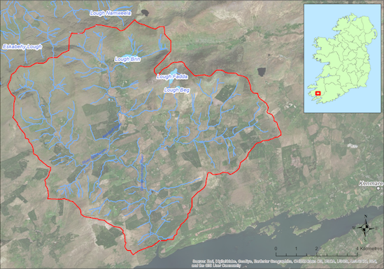 Located the southern side of the Iveragh Peninsula the catchment (88.3 sq km) drains to Kenmare Bay to the South. The catchment covers the lower slopes of the Macgillicuddy’s Reeks and has a number if lakes including Lough Brin from which the Kealduff River flows southwards. The underlying geology is Old Red Sandstone and the dominant soil type is peat. Land use within the catchment includes extensive areas of forestry (15%), mixed livestock farming (ca 116 active farmers), and historic peat cutting. The population of freshwater pearl mussels is estimated to be ca. 2.7 million and occurs in the lower reaches of all of the main tributaries.