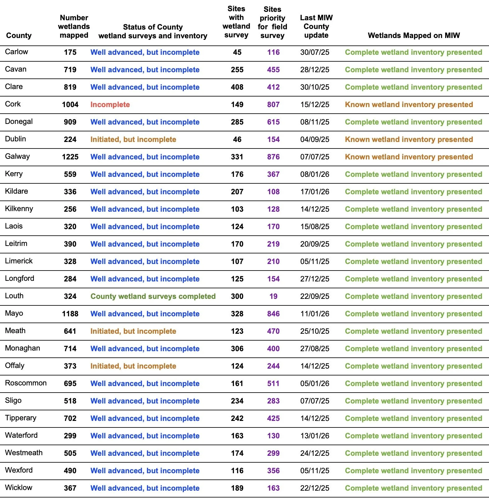An indication of the number of wetlands currently mapped in each county; the status of our knowledge of the wetland resource in each county; and sites that require a wetland survey is presented in the table below.