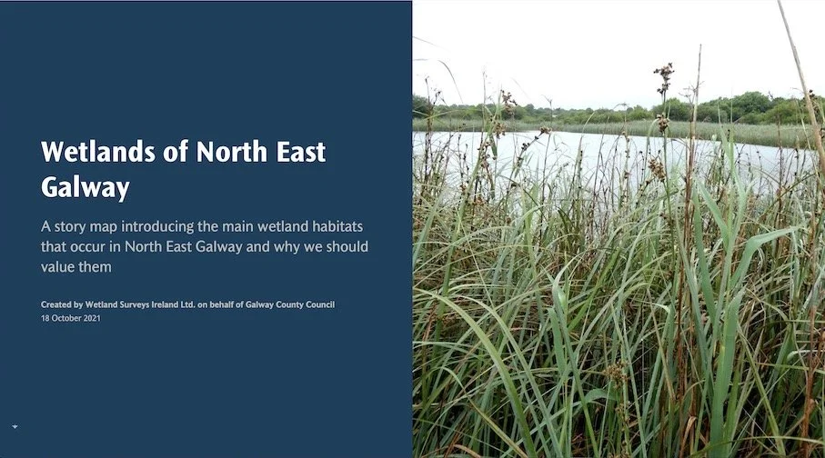 Wetlands of North East Galway - a story map introducing the main wetland habitats that occur in North East Galway and why we should value them was launched by Galway County Council as part of Heritage Week 2022 events. The story map features a range of information about the wetlands found in NE County Galway, their importance to our wildlife and the ecosystem services they provide us with. The story map includes a section on wetlands to visit in NE County Galway. It also lists a series of measures that we can all take to help protect wetland habitats.